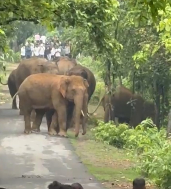 बीच सड़क पहुँचा हाथियों का दल…घंटों तक जाम रहा रास्ता…जान जोखिम में डालकर सेल्फी ले रहे लोग…