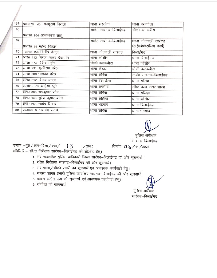Big Breaking : सारंगढ़ बिलाईगढ़ जिले में पुलिस विभाग में बड़ा फेरबदल…80 पुलिस कर्मियों का तबादला…देखे पूरी लिस्ट…