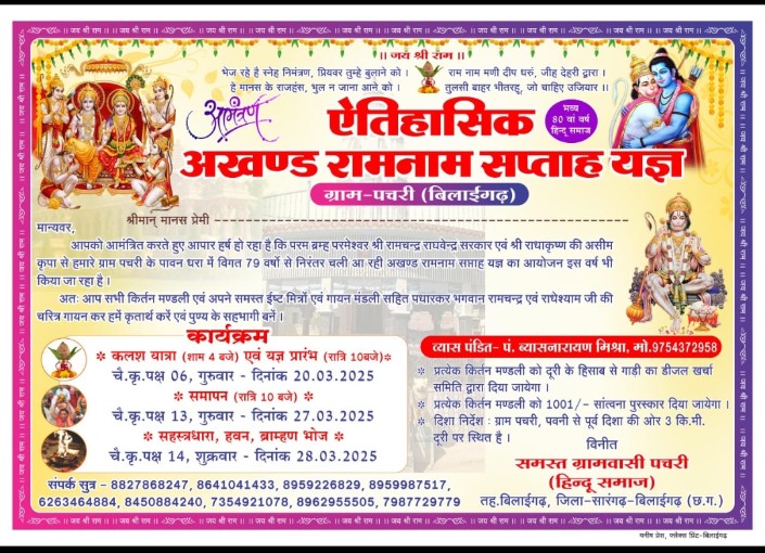 बिलाईगढ़ : पवनी से 3 किलोमीटर पूर्व दिशा की ओर बसे ग्राम पंचायत पचरी में प्रतिवर्षानुसार इस वर्ष भी मर्यादा पुरुषोत्तम भगवान श्री राम चंद्र जी की असीम कृपा से भव्य ऐतिहासिक सात दिवसीय अखंड रामनाम सप्ताह का शुभारंभ आज दिनाँक 20-3-2025 दिन गुरुवार से हो रही है।